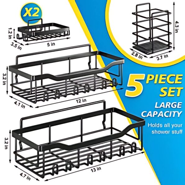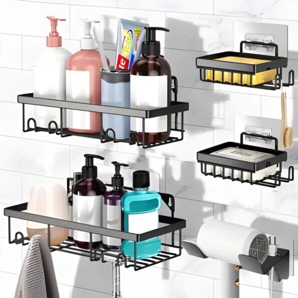 5 in 1 Bathroom Accessories 5-in-1 Self-Adhesive Bathroom Organizer Combo | No-Drill Wall-Mounted Self-Adhesive Wall Shelf Set with Soap Dish, Toothbrush Holder & Metal Racks (Black)